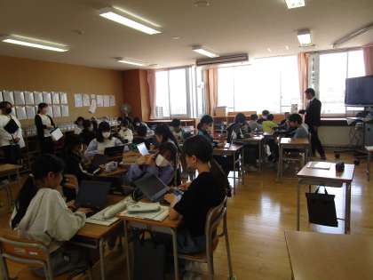 授業参観の様子です。クロムブックを使って自分の生活を見直し、どのように時間を使っているかグループで分析する活動を行いました。