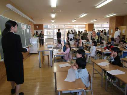 1年生は、「うたにあわせて あいうえお」をみんなで元気に音読しました。その後、「う」のつく言葉をみんなで考えました。