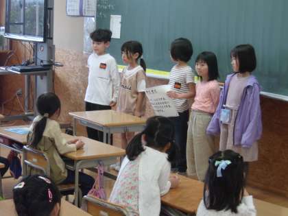 今日は、1年生さんに学校を案内する「学校たんけん」の本番でした。「1年生にやさしく案内したい」「大きな声で伝えたい」等、一人一人目当てをもって,友達と協力しながら学校を案内したり、紹介したりすることができました。