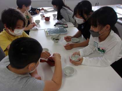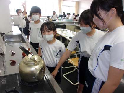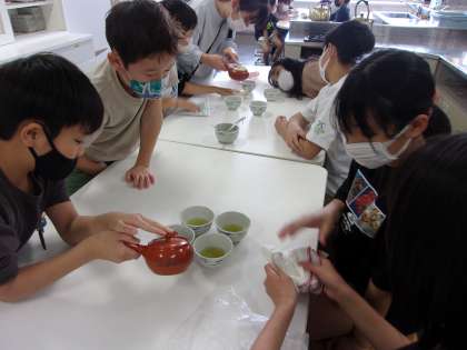 家庭科の学習では、お茶を入れて飲みました。グループで協力してお湯を沸かしたり、急須でお茶を入れたりして、和気あいあいと活動していました。「苦い!」と言いながらも飲み干したり、「おいしい」とおかわりしたりと子供によって反応も様々でした。家でもお茶を入れてみたいという思いをもっている子もいて、お茶に興味をもったようです。