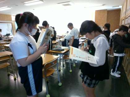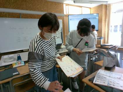 外国語の授業では、友達に名前のつづりと好きな教科を質問しました。友達の話すアルファベットをしっかり聞き取り、名前を書いていました。