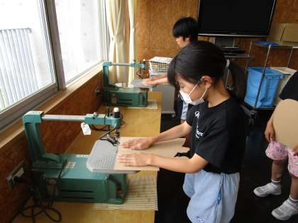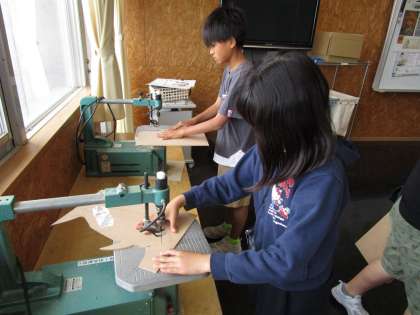 図画工作科の時間に、糸のこを使って木の板を切り、ホワイトボードをつくっています。思うように糸のこをコントロールできずに苦戦する子供たちですが、繰り返し使っていくうちにだんだん慣れてきました。安全に気を付け、集中して取り組んでいます。