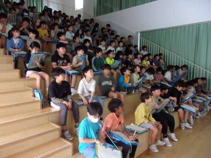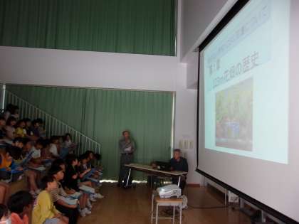 今日は、地域の方から123m花畑についてのお話を聞きました。子供たちは、熱心にメモをとりながら話を聞いていました。花の苗の植え付けに向けて、がんばろうという気持ちを高めています。
