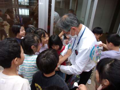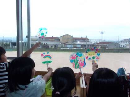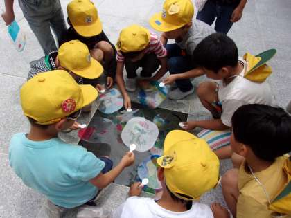 図画工作科「ひかりのプレゼント」で、透明なうちわにシールやマジックを使って、自分が好きなものを表現しました。太陽の光に当ててながら、キラキラ光る色やもようを楽しみました。校長先生の白いシャツにも綺麗な模様が映りました。