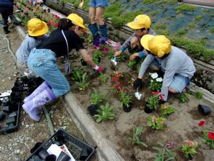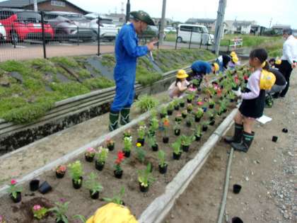 今日は、地域の方々と一緒に123m花畑に苗を植えました。地域の方に花の植え方を教わりながら班の友達と協力して苗を植えました。これからお世話をがんばっていこうと思います。