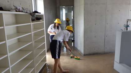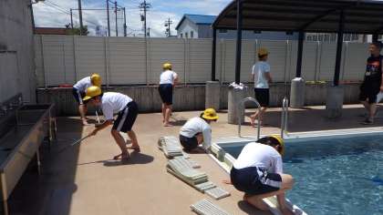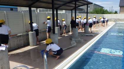 来週のプール開きに向けて、6年生で協力してプールの清掃を行いました。