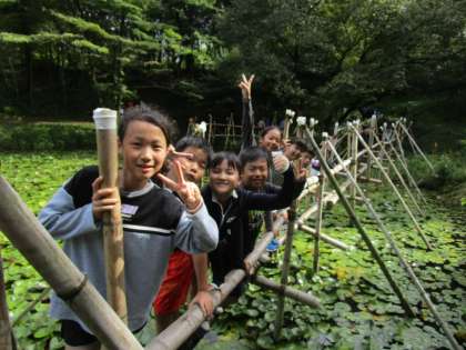 池遊びの様子です。池の上の一本道を歩いたり、ターザンロープで遊んだりしました。