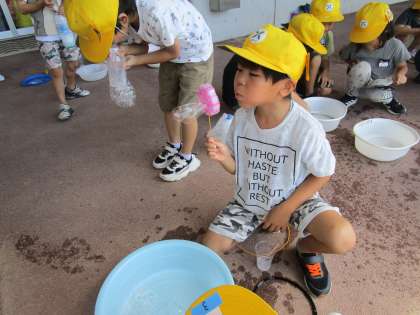 1年生は、生活科でしゃぼん玉遊びを行いました。しゃぼん玉の液や道具を工夫しました。いろいろなしゃぼん玉を作って、しゃぼん玉遊びを楽しみました。