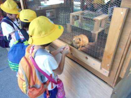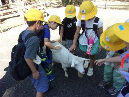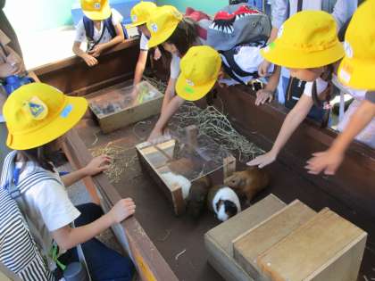 モルモットやヤギをやさしく触ったり、えさをあげたりしました。子供たちは「かわいい」や「ふわふわしている」などと友達と話をしながら動物とふれあっていました。