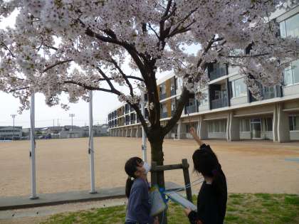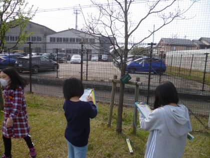 あたたかくなり、きれいな花が咲いています。理科では一年を通して、気温の変化とともに植物がどのように変化していくのかを観察していきます。今日は、観察する植物を一つ決め、カードに記録しました。
