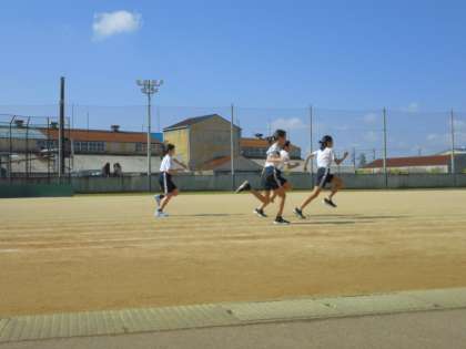 50メートル走の記録測定を行いました。スタートのときの重心の位置に気を付けながら練習しました。青空の下でおもいっきり走りました。
