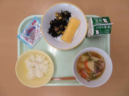 ご飯 牛乳 たまごロール ひじきとコーンのソテー ベーコンとじゃがいものにもの しらすのつくだに
