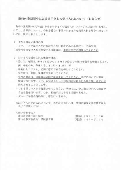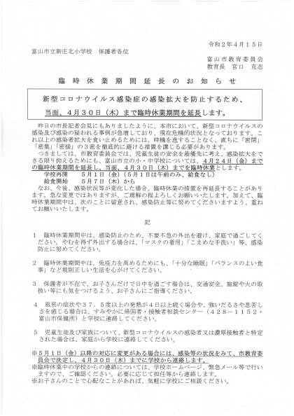 富山市教育委員会より連絡があり、新型コロナウイルス感染症の感染拡大を防止するため、当面、4月30日(木)まで臨時休業期間を延長します。
