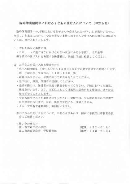 富山市教育委員会より連絡があり、新型コロナウイルス感染症の感染拡大を防止するため、当面、5月6日(水)まで臨時休業期間を延長します。