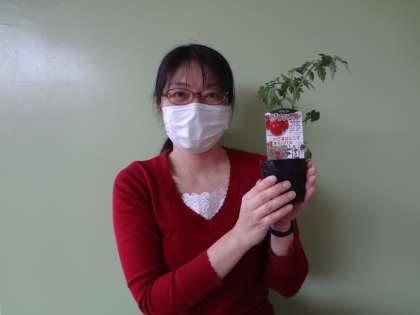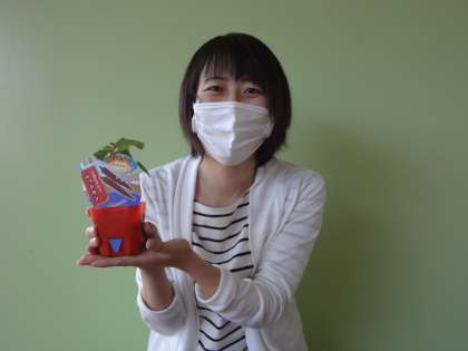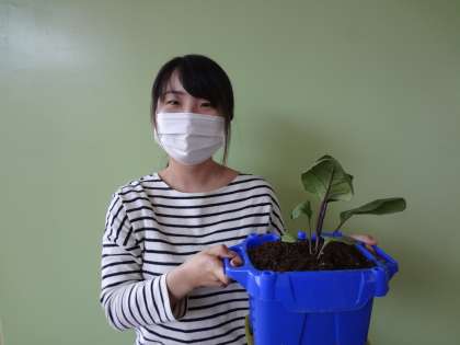 はままつ先生はミニトマト、まつい先生はオクラ、にっ田先生はなすの なえを うえました。あおい うえ木ばちの 中で、げん気に そだつように ねがいながら うえました。