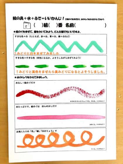 今週も、図画工作科のかだいを出しました。今週は、絵の具のまぜ方や水のりょうをいろいろためしてみましょう。一番下のわくには、お気に入りの「色」「線」「水のりょう」をかきましょう。みなさんがどんな線をかくのか、楽しみにしています。