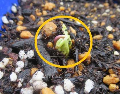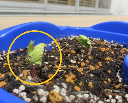 13にちに たねを うえた さとうせんせいの あさがおは、きのうは、なんにも でていなかったのに、きょうの あさ みたら、ちいさな めが、おじぎを するように でていました。とても うれしかったよ。