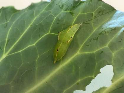 よう虫の世話をしている時に、1ぴきだけようすがちがうことに気づきました。今までとはすがたもちがうし、じっとしていてうごきません。キャベツもぜんぜん食べなくなりました。さて、ここでクイズです。よう虫は何になったのでしょう。理科の教科書でしらべてみてくださいね。