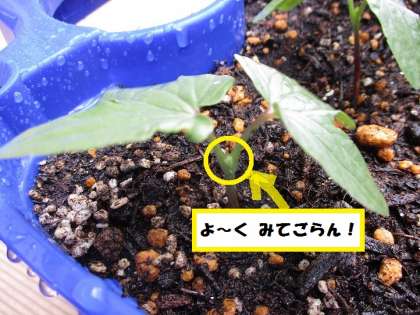 でもね、もっと あさがおに ちかづいて よくみてみると、あらあら!ちいさな ちいさな はっぱの あかちゃんの ようなものが みつかりましたよ。