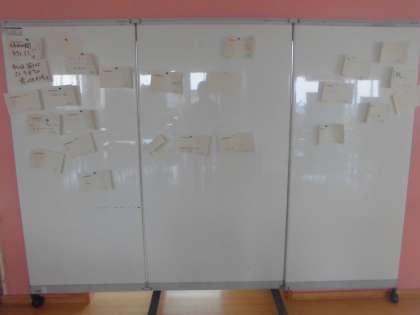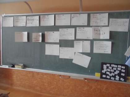 AグループとBグループの子供たちは、掲示板のメッセージでやり取りしています。「最近見たおもしろい動画は何ですか」と質問を書いたり、「来週会おうね」とメッセージを書いたりしています。