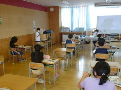 今日は理科の学習でヘチマの苗の観察をしました。真上から苗を見て、葉の付き方を確かめたり、子葉と本葉の色や形の違いを見付けたりしていました。