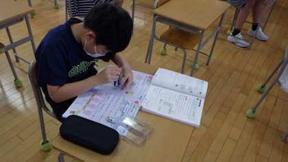 算数科では、つりあいのとれた図形の学習をしています。今日は、点対称の図形の作図をしました。作図に慣れたら、複雑な形の作図にも挑戦していました。