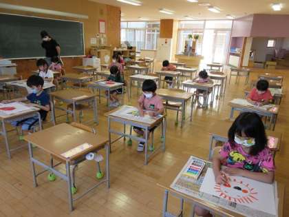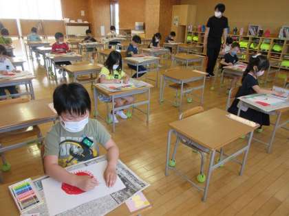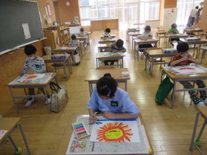 図画工作科の授業で、画用紙いっぱいに「おひさま」を描きました。色や形、お日さまに集まってくるものを思い浮かべて一生懸命描いていました。にこにこ笑顔の「おひさま」を描く子供たちの表情は、まるで自分がお日さまになったようにすてきな笑顔で、楽しそうでした。
