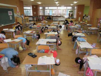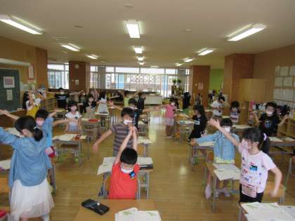 国語では、「たんぽぽのちえ」の学習をしています。今日は、たんぽぽの様子を体で表しました。左の写真は、黄色いたんぽぽがさいている様子、右の写真は、花のじくがぐったりとたおれている様子です。子供たちは、たんぽぽの様子を表現しながら、たんぽぽのちえを見付けていました。