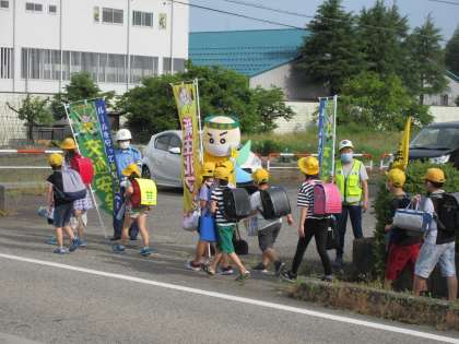 子供たちが学校に向かう途中で、交通安全協会新庄北支部の方々と共に「新庄北マン」も子供たちの安全を見守っていました。安全に気を付けて、元気よく登校するよう子供たちと挨拶を交わしています。