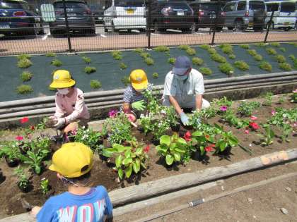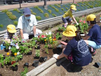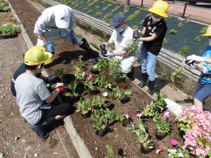 クラス別に地域の方の力をかりながら、自分たちでデザインした花畑になるように、たくさんの種類の苗を花畑に植えていきました。