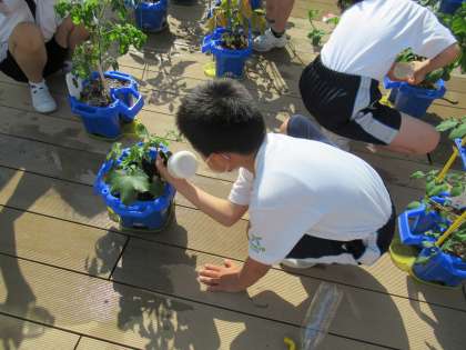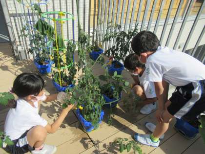 毎朝、子供たちは野菜の水やりをしています。水やりの様子を見に行くと、「先生、ナスの実がなったよ」と教えくれるなど、毎日野菜の成長を楽しみにしています。