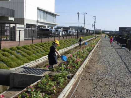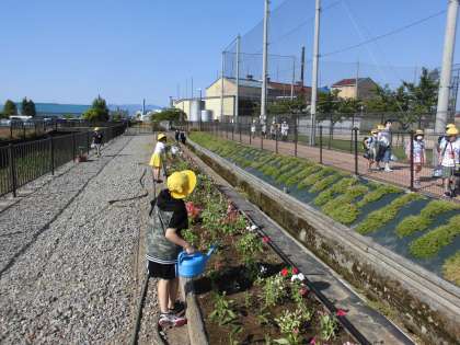 今日から123m花畑の水やりがスタートしました。担当の子供たちが登校してすぐにじょうろで水をあげています。自分たちの植えた花がきれいにさくように、心をこめて丁寧に活動するなど、真剣に活動に取り組む姿が見られます。