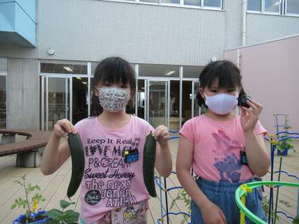 野菜を収穫する子も出てきました。「きゅうりを家族みんなで食べたいな。」「麻婆なすにして食べたいな。」と、収穫の喜びを話していました。みんなの野菜もおいしく育ってほしいです。