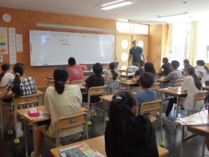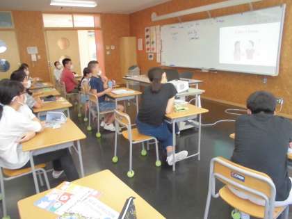 外国語の学習では、自分の住所や休日の過ごし方等を表現する英語のフレーズを学習しています。今日は、聞き取れる単語を手がかりに、何を伝えている映像なのかをみんなで考えました。