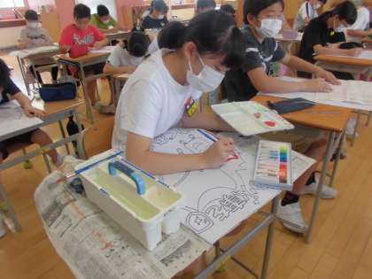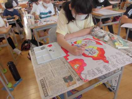 防火ポスターづくりを進めています。下絵が完成した人から色を付けています。目を引く作品になるように、色使いを考えて仕上げていきます。