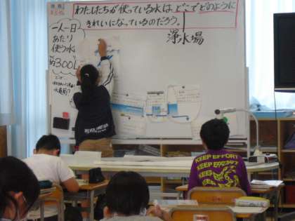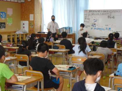 社会科の学習で、水道水が学校や家庭に届くまで、どのようにしてきれいにされているのかを調べました。浄水場で働く人は、水をろ過して濁りを取り除いたり、消毒したりするなど、様々なことをしていると子供たちは知りました。時間や手間をかけてきれいにされた水を大切に使おうという気持ちを高めていました。