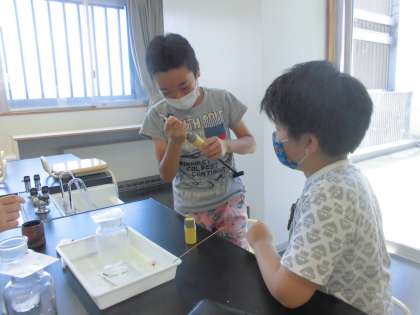 理科では、物の燃え方について学習しています。物が燃える前と燃えた後の空気の様子の違いを気体検知管と石灰水を用いて調べました。