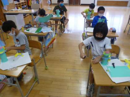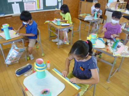 図画工作科では、ビー玉が転がる迷路をつくっています。子供たちは、らせん状のコースや落とし穴、階段になっているコース等、楽しいコースをつくろうと工夫していました。また、何度もビー玉を転がし、試しながらつくっています。どのような迷路ができるのか楽しみです。