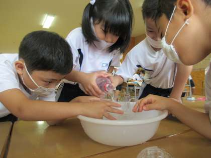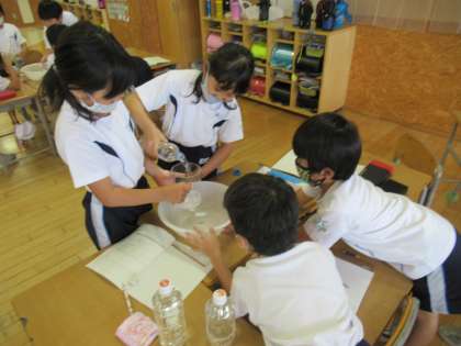 今日は、1Lカップを使って水のかさを調べました。dLカップで水のかさを調べた経験を生かして、予想を立てていました。今日もグループで準備から片付けまで協力して進めることができました。