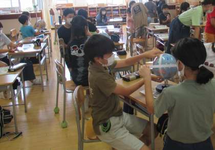 音楽では、短調や長調の違いを木琴や鉄琴を使って実際に体験しました。社会では、地球儀を使い方を協力しながら学習していました。国語の学習では、みんなが過ごしやすくなる工夫をパソコンや本を使って、一生懸命に調べる姿が見られました。