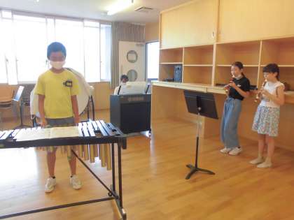 グループごとに合奏の練習を進めています。今は、担当楽器を演奏できるように練習中です。同じ旋律を担当する友達と一緒に確認しながら進めています。