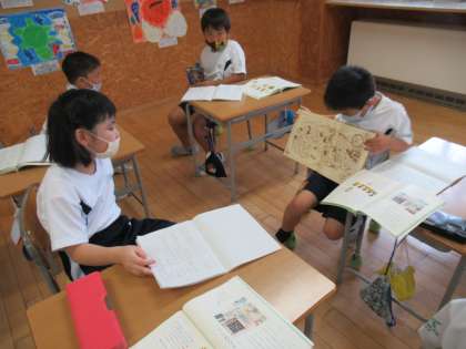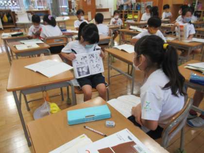 国語科の学習で、自分のお気に入りの本を紹介します。この日は、ペアで本の紹介の練習をしました。友達に質問され、どのように言ったら本のよさが伝わるか、考えていました。
