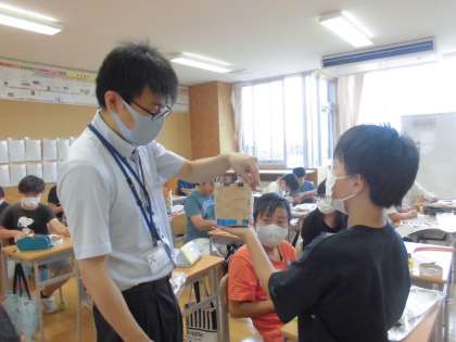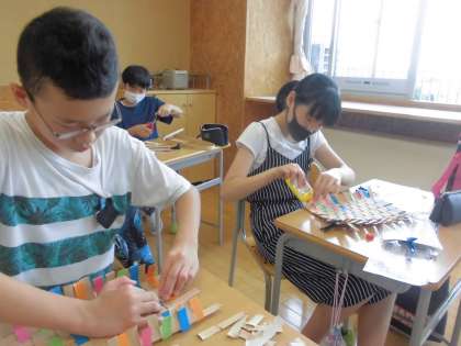 図工の学習では、紙バンドを編み込んで作品づくりを進めています。完成したらどのように使うのか、使いみちを考えながら取り組んでいます。