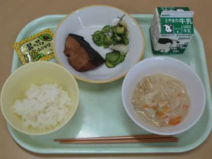 ごはん 牛乳 ふくらぎのてりやき こんぶあえ ごじる なのはなふりかけ