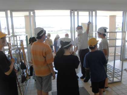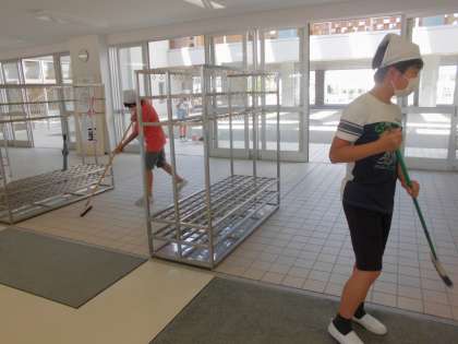 今日から清掃活動が始まりました。児童玄関担当の子供たちは、校長先生からほうきの種類や使い方を教えていただき、清掃の仕方を確認してから取り組んでいました。