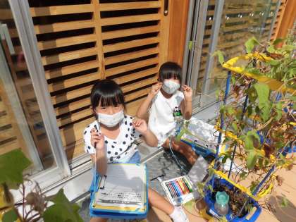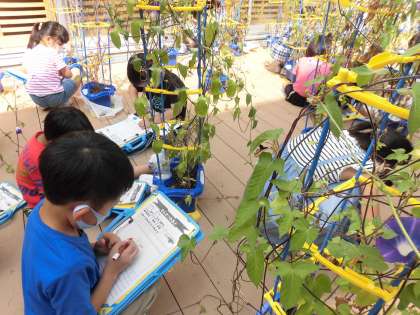ピロティーに、子供たちの朝顔が再び集まりました。今、大事に育ててきた朝顔に次々と種ができてきています。今日は種の様子を観察しました。「植えた種の数は3個だったのに、数え切れないくらいたくさんの種ができたよ」と嬉しそうに話す子供たちでした。
