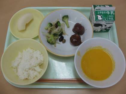 ごはん 牛乳 にくだんご ビーンズサラダ なし かぼちゃポタージュ