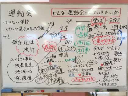 2学期に入り、運動会に向けての準備が本格的に始まりました。6年生全員で、どんな運動会にしたいのか話し合いました。今年の状況のことも理解しつつ、それでも開催できることを感謝したいという思いや、安全な環境を心がけたいという意見もありました。また、学級ごとに運動会のスローガンに入れる言葉も考えました。