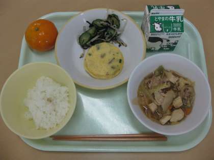 ごはん 牛乳 かにたま いそあえ かんこくふうすきやき