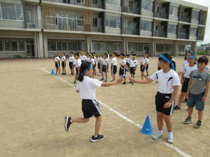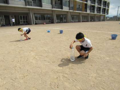 今日から、運動会の団体競技の練習が始まりました。3年生は「Let's go! 満水レース」を行います。ペットボトルにいかに早く、こぼさず水を入れるか、チームで作戦を立てながら練習に取り組んでいます。3種類ある道具の中から何を選ぶかも重要なポイントです。仲間と協力し、1位を目指してこれからの練習も頑張っていきましょう。
